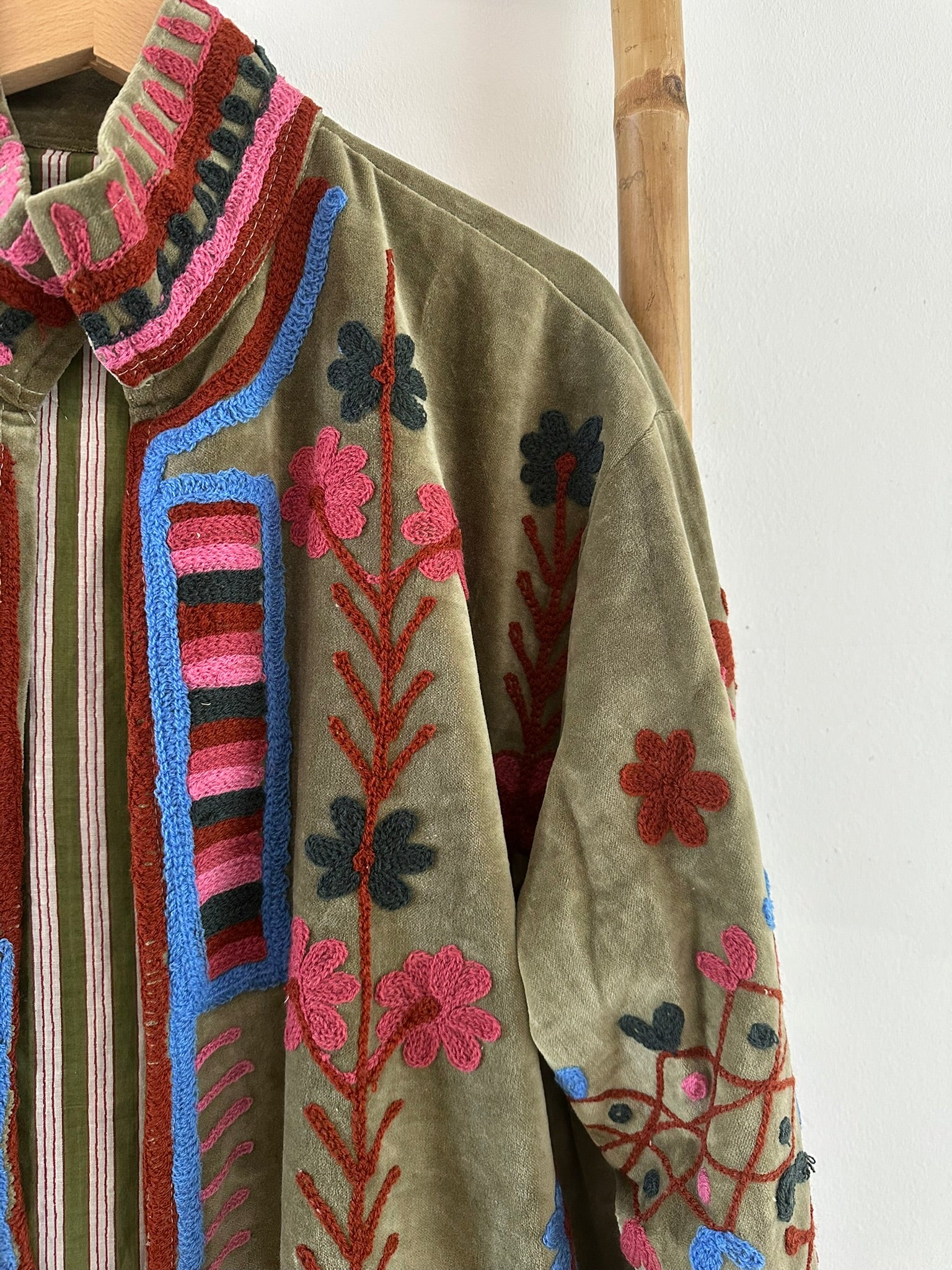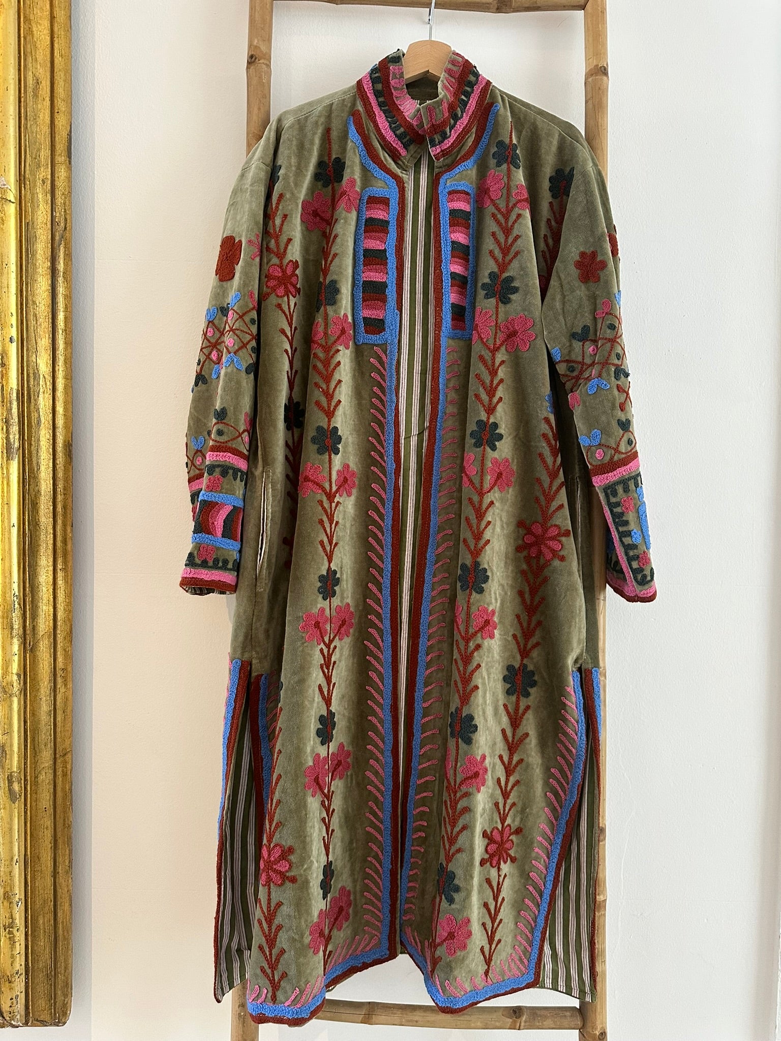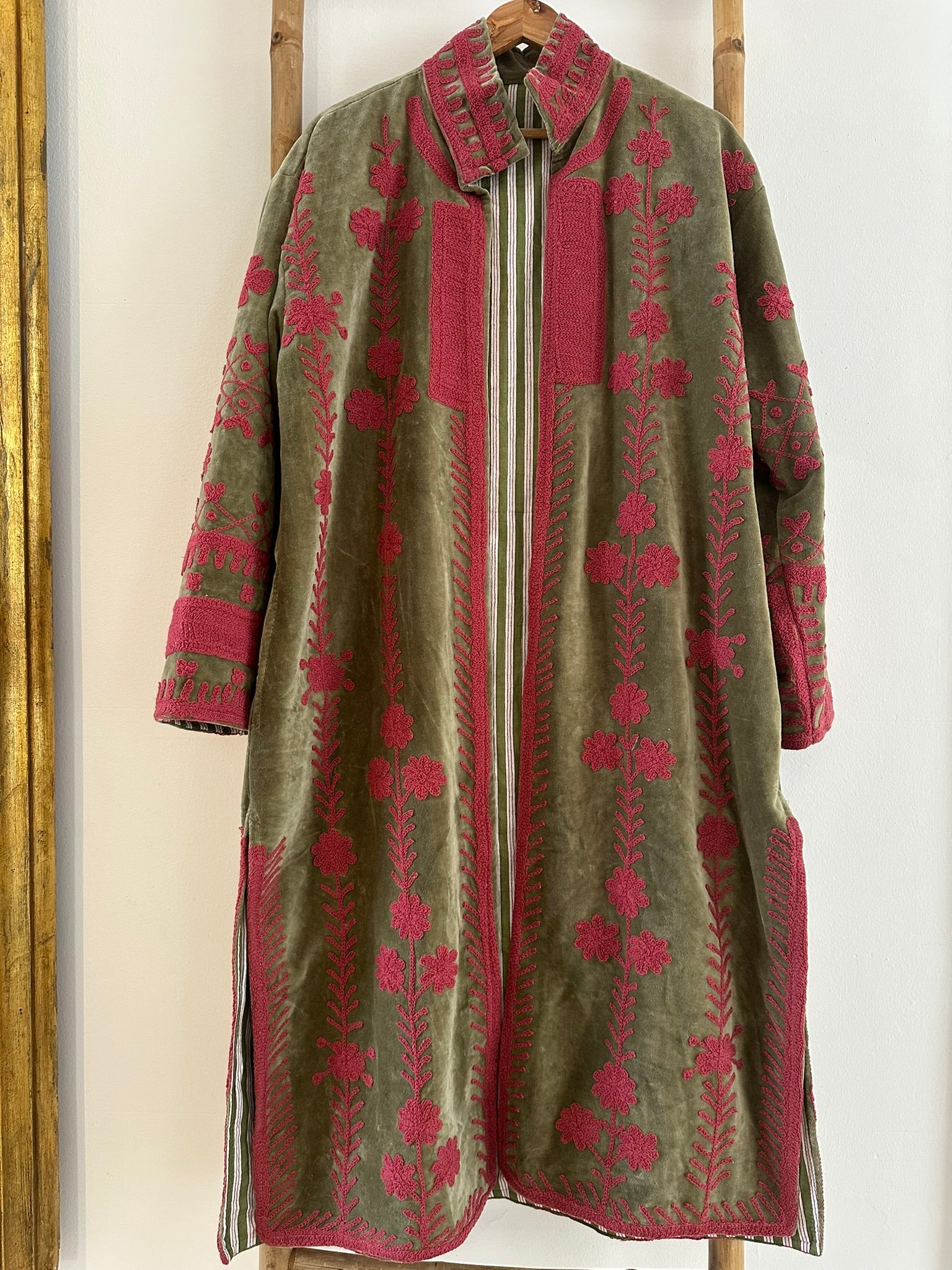 Este casaco comprido em veludo combina elegância e conforto. Com bordados detalhados, bolsos práticos e forro interior, é uma peça sofisticada e versátil.